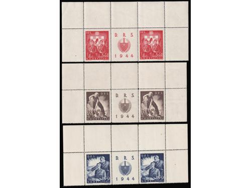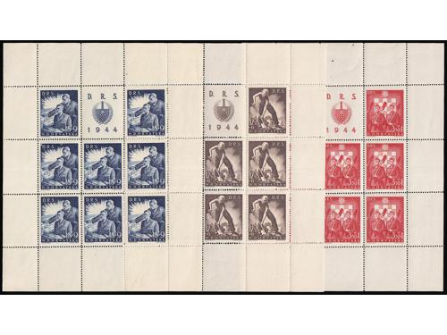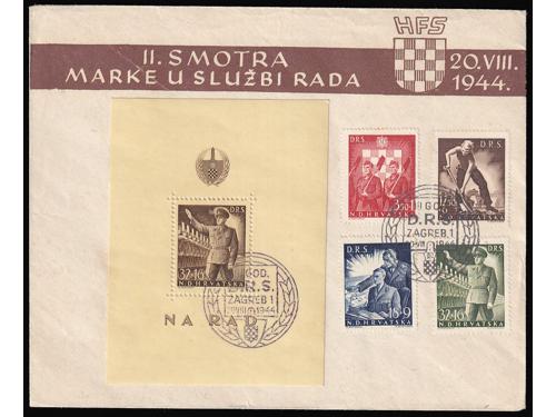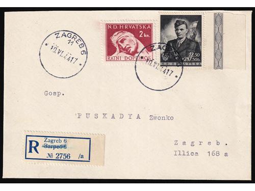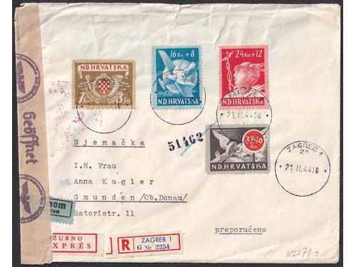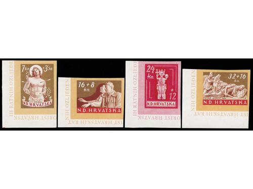 Aukcija br. 74 - Filatelija i razglednice Nezavisna Država Hrvatska ✉ 348 - Preporučeno i žurno upućeno pismo iz Mostara u Zagreb Ministarstvu seljačkog gospodarstva 02.07. 1944. 20 EUR ✉ 349 - Preporučeno, zrakoplovom i žurno upućeno pismo iz Zagreba u Gmunden 21.2. 1944. 30 EUR (*) 350 - Michel br. 154/157 na karton-papiru za umjetnički tisak. 200 EUR ** 351 - Michel br. 154/157, nezupčani arčići u odličnoj kvaliteti. 90 EUR ✉ 352 - Preporučeno pismo upućeno iz Osijeka u Briey u Francuskoj 22.04. 1944 30 EUR ✈ 353 - Preporučeno i zrakoplovom upućeno pismo iz Zagreba u Gmunden 27.3. 1944. 20 EUR ✉ 354 - Preporučeno pismo upućeno iz Zagreba u Gmunden 01.06. 1944. 25 EUR ✉ 355 - Preporučeno pismo upućeno loko Zagreb 10.06. 1944. 55 EUR ✉ 356 - Michel br. 62B-64B gornji trojac arka s vinjetom u sredini zupčan linijski 14 ½ 100 EUR ** 357 - Michel br. 162B-164B zupčanje 14 ½ bečko, kompletni arci u odličnoj kvaliteti. 480 EUR ✉ 358 - Michel br. 162/166 FDC s blokom. 45 EUR (*) 359 - Michel br. 166 probni nezupčani otisak bloka u karminsmeđoj boji. 160 EUR ←8910111213141516→
