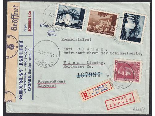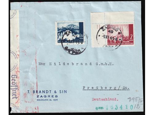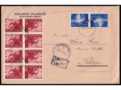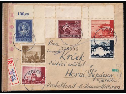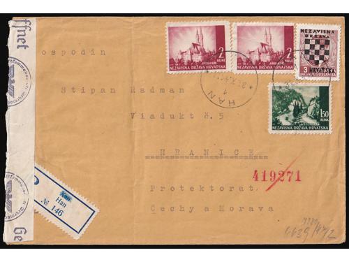 Aukcija br. 74 - Filatelija i razglednice Nezavisna Država Hrvatska ** 276 - Michel br. 50 kompletan araka na papiru za offsetni tisak. 340 EUR ** 277 - Michel br. 53 kompletan arak na poroznom papiru. 220 EUR ** 278 - Michel br. 53 kompletan arak otisnut na poroznom papiru. 110 EUR ** 279 - Michel br. 53 kompletan arak otisnut na papiru za offsetni tisak. 35 EUR ** 280 - Michel br. 54 kompletan arak na papiru za offsetni tisak. 40 EUR ✈ 281 - Pismo upućeno zrakoplovom iz Siska u Beč 12.04. 1943. 14 EUR ✉ 282 - Filatelistički inspirirano preporučeno pismo upućeno iz Borova u Češki Protektorat 02.10. 1943. 20 EUR ✉ 283 - Preporučeno pismo upućeno iz Slavonskog Broda u Požegu 28.03. 1942. 30 EUR ✉ 284 - Pismo upućeno iz Zagreba u Njemačku. 35 EUR ✉ 285 - Preporučeno pismo upućeno iz Nove Pazove u Nizozemsku 27.11. ?? 35 EUR ✉ 286 - Preporučeno i žurno upućeno pismo iz Zagreba u Beč 15.01. 1942. 25 EUR ✉ 287 - Preporučeno pismo upućeno iz Hana (Dalmatinski, kod Sinja) u Protektorat 31.10. 1941. 90 EUR ←2345678910→