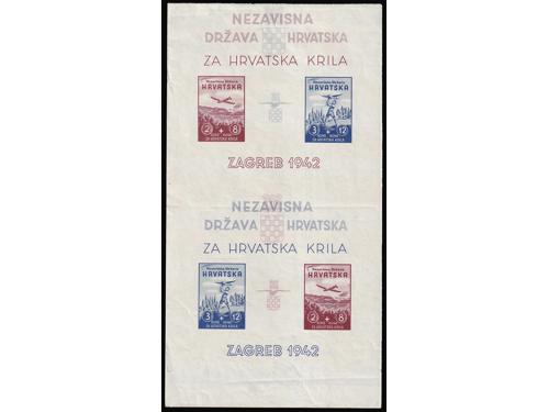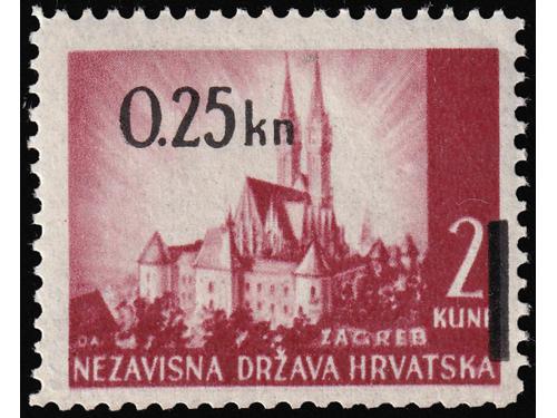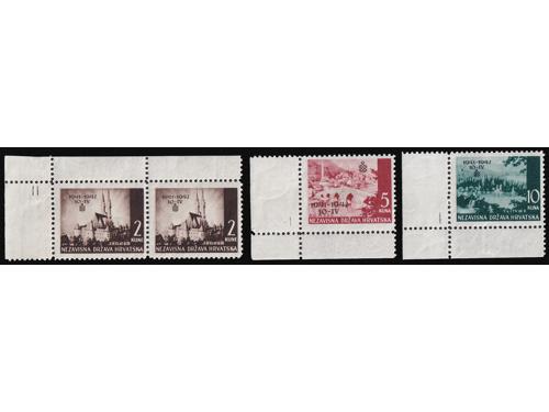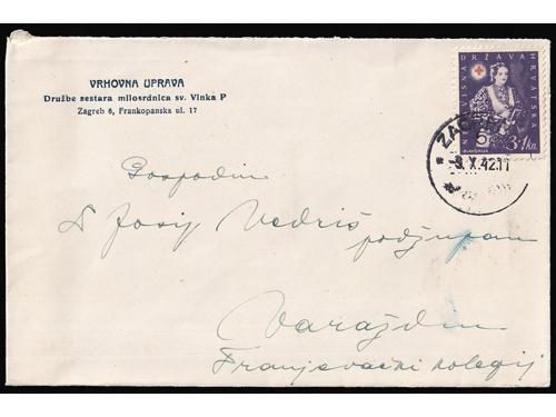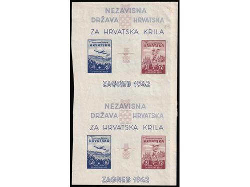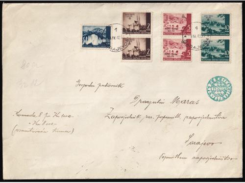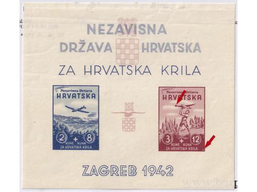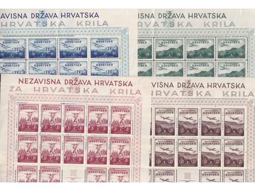 Aukcija br. 74 - Filatelija i razglednice Nezavisna Država Hrvatska ** 300 - Michel br. 76/77 nezupčani blok Za hrvatska krila 50 EUR ** 301 - Michel br. 70/73 kompletni arci s privjeskom u sredini i u odličnoj kvaliteti. 100 EUR ** 302 - Okomiti nezupčani par blokova Za Hrvatska krila 200 EUR ** 303 - Okomiti nezupčani par blokova Za Hrvatska krila, 200 EUR ** 304 - Michel broj 78/80 s oznakama tiskarskih ploča. 20 EUR ✉ 305 - Vrijednosno pismo većeg formata upućeno loko Sarajevo 11.04. 1942. 40 EUR ** 306 - Michel br. 81 kompletan arak povodom filatelističke izložbe u Banja Luci. 320 EUR ** 307 - Michel br. 82 s probnim, crnim pretiskom. 240 EUR (*) 308 - Michel br. 83/85 nezupčani parovi iz gornjeg desnog kuta arka. 40 EUR ✉ 309 - FDC Crveni Križ 1942 preporučeno upućen iz Zagreba u Leipzig (Njemačka). 35 EUR ✉ 310 - Pismo točno frankirano markom 3 kn iz niza II Crveni križ 1942 i upućeno iz Zagreba u Varaždin 09.10. 1941. 18 EUR ** 311 - Michel br. 86/90 kompletni arci u odličnoj kvaliteti. 140 EUR ←456789101112→