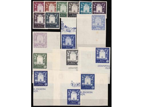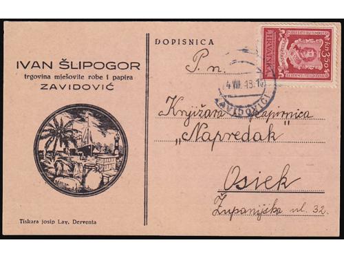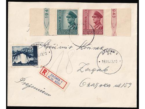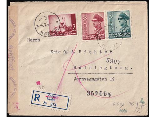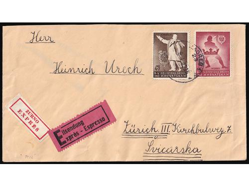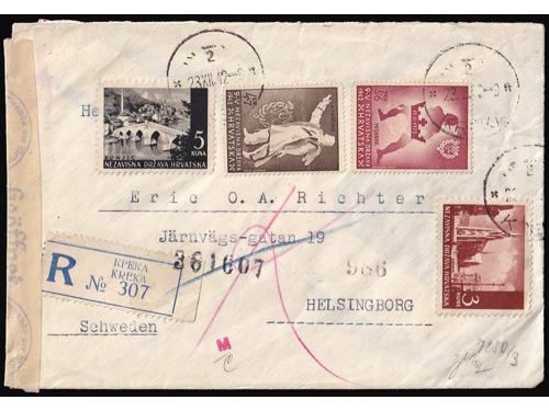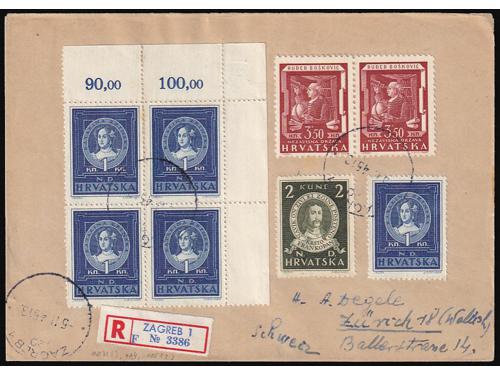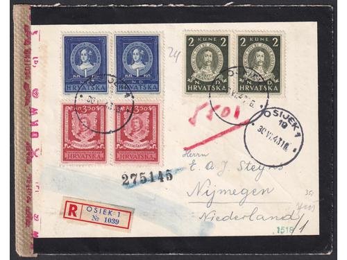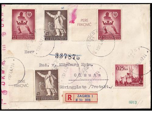 Aukcija br. 74 - Filatelija i razglednice Nezavisna Država Hrvatska ✉ 312 - Pismo upućeno žurno iz Zagreba u Švicarsku 08.01. 1943. 30 EUR ✉ 313 - Preporučeno pismo upućeno iz Zagreba u Olmutz (Protektorat) 19.12. 1942. 35 EUR ✉ 314 - Preporučeno pismo upućeno iz Kreke u Švedsku 23.12. 1942. 35 EUR ✉ 315 - Preporučeno pismo upućeno iz Sarajeva u Brno 08.02. 1943. 35 EUR (*) 316 - Michel br. 97 lot 17 raznih probnih otisaka, nezupčanih, faza tiska itd 140 EUR ✉ 317 - Preporučeno upućeno pismo loko Zagreb 15.08. 1943. 45 EUR ✉ 318 - Preporučeno pismo upućeno iz Kreke u Švedsku 08.05. 1943. 35 EUR ✉ 319 - Preporučeno pismo upućeno iz Zagreba u Osijek 18.05. 1943. 180 EUR ✉ 320 - Reklamna dopisnica upućena iz Zavidovića u Osijek 24.08. 1943. 16 EUR ✉ 321 - Preporučeno upućeno pismo iz Zagreba u Švicarsku 05.02. 1945. 20 EUR ✉ 322 - Preporučeno upućena dopisnica iz Zagreba u Gmunden 22.6. 1943. 25 EUR ✉ 323 - Preporučeno pismo upućeno iz Osijeka u Nizozemsku 30.06. 1943. 20 EUR ←5678910111213→