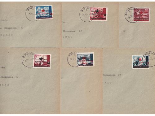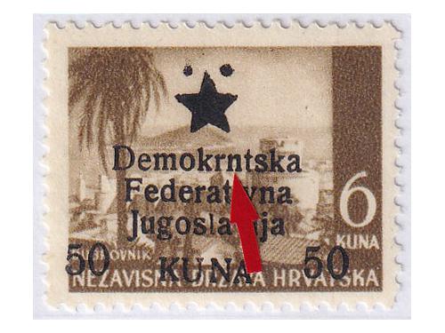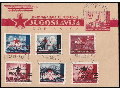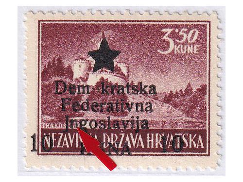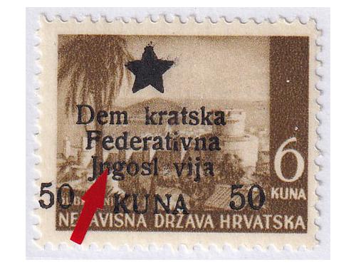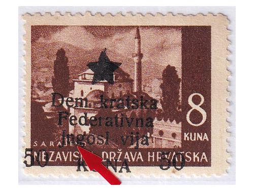 Aukcija br. 74 - Filatelija i razglednice Partizani i provizorna izdanja ** 928 - Provizorno izdanje za Mostar pretisak 10/3.50 kn. Pogreška pretiska 70 polja 20 EUR ** 929 - Provizorno izdanje za Mostar pretisak 50/6 kn. Pogreška pretiska 49 polja 30 EUR ** 930 - Provizorno izdanje za Mostar pretisak 50/6 kn. Pogreška pretiska 70 polja 30 EUR (*) 931 - Provizorno izdanje za Mostar pretisak 50/8 kn. Pogreška pretiska 70 polja 60 EUR ** 932 - Provizorno izdanje za Mostar, probojni pretisak na marci 30/1 kn Katarina Zrinska. 20 EUR ✉ 933 - Dopisnica, provizorno izdanje za Zagreb frankirana sa 6 raznih maraka provizornog izdanja za Zagreb 18 EUR ** 934 - Provizorno izdanje za Zagreb 160/0,50 kn na rijetkom pelir papiru. 40 EUR ✉ 935 - Šest koverta frankiranih markama Zagrebačkog provizornog izdanja i poništene žigom Bjelovar 6 30 EUR ** 936 - Provizorno izdanje za Zagreb, pretisak 60 na 3,50 kn. arak 100x ali razdvojen okomito po sredini. 16 EUR ** 937 - Provizorno izdanje za Zagreb, pretisak 20 na 5 kn. arak 100x ali razdvojen po okomito sredini. 16 EUR ** 938 - Provizorno izdanje za Zagreb, pretisak 80 2 kn arak 100x ali razdvojen vodoravno po sredini 16 EUR 939 - Provizorno izdanje za Zagreb, lot 50 serija, a nekih nominala i više od 50 25 EUR ←123456→