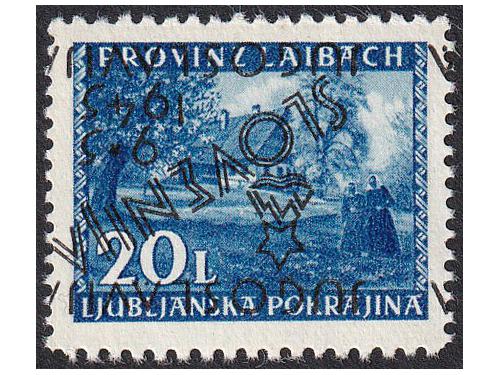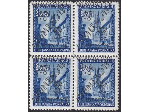 Aukcija br. 74 - Filatelija i razglednice Partizani i provizorna izdanja ** 952 - Provizorno izdanje za Ljubljanu, četverac 1,25 lira obrnuti pretisak. 80 EUR ** 953 - Provizorno izdanje za Ljubljanu 20 lira, obrnuti pretisak. 75 EUR ** 954 - Provizorno izdanje za Ljubljanu, sedam raznih vrijednosti sve sa oznakama na marginama. 16 EUR ✉ 955 - Koverta s četiri marke provizornog izdanja za Ljubljanu poništena žigom Ljubljana. 10 EUR ** 956 - Provizorno izdanje za Ljubljanu 5 centi, Michel br. 1 kompletan arak 30 EUR ** 957 - Provizorno izdanje za Ljubljanu 10 centi, Michel br. 2, kompletan arak 40 EUR ** 958 - Provizorno izdanje za Ljubljanu 20 centi, Michel br. 3, kompletan arak 45 EUR ** 959 - Provizorno izdanje za Ljubljanu 25 centi, Michel br. 4, kompletan arak 30 EUR ** 960 - Provizorno izdanje za Ljubljanu 1 lira Michel br. 7a, kompletan arak 30 EUR ** 961 - Provizorno izdanje za Ljubljanu 1,25 lira, Michel br. 8, kompletan arak 30 EUR ** 962 - Provizorno izdanje za Ljubljanu 1,50 lira, Michel br. 9, kompletan arak 30 EUR ** 963 - Provizorno izdanje za Ljubljanu 2 lire, Michel br. 10, kompletan arak 35 EUR ←123456→
