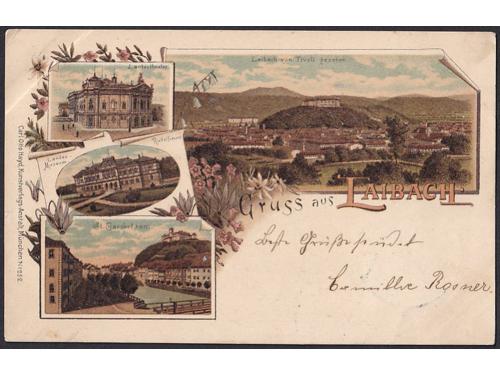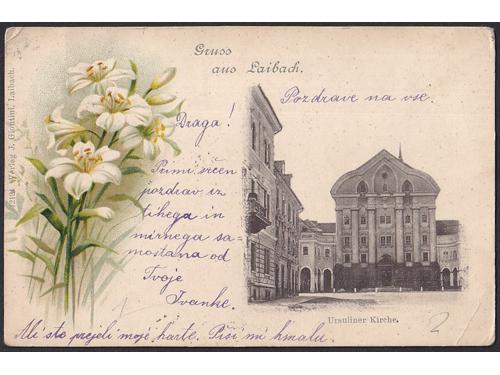 Aukcija br. 74 - Filatelija i razglednice Razglednice - Slovenija #/A-B 2296 - Golica 1898. 35 EUR #/A-B 2297 - Pozdrav iz Komende 1898. 35 EUR #/A 2298 - Kopar 1898. 16 EUR O/A 2299 - Kopar oko 1904. 16 EUR #/A-B 2300 - Kranj oko 1904. 16 EUR #/A-B 2301 - Laško 1899. 20 EUR #/A-B 2302 - Laško 1899. 20 EUR #/A-B 2303 - Laško 1901. 16 EUR #/A-B 2304 - Litija 1902. 16 EUR O/B 2305 - Lužarji oko 1910. 30 EUR #/A-B 2306 - Ljubljana 1898. 20 EUR X/B 2307 - Ljubljana oko 1904. 18 EUR ←1234→