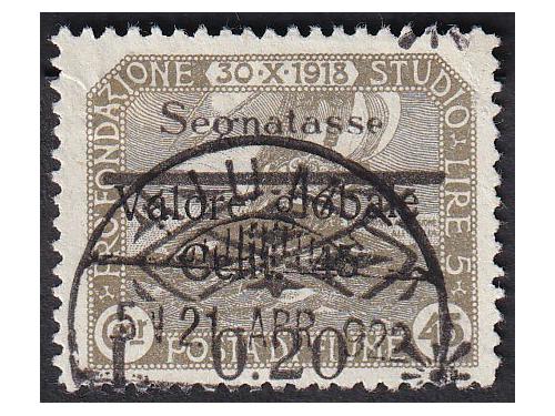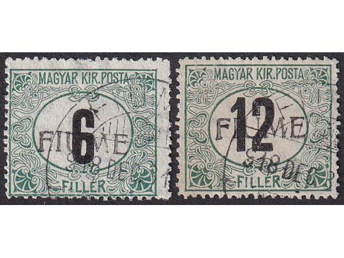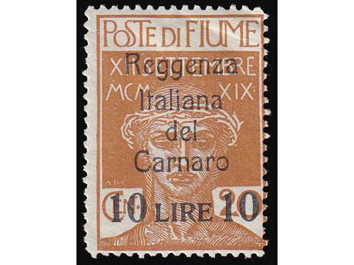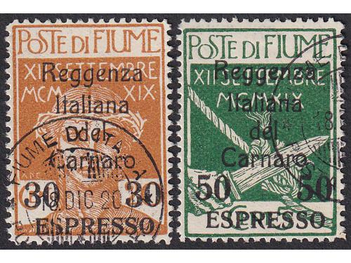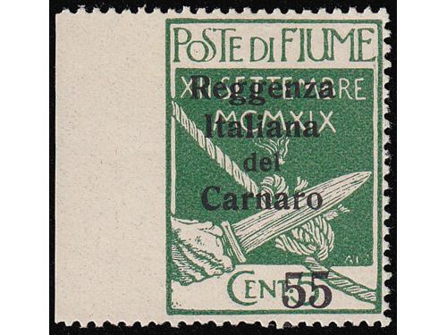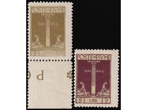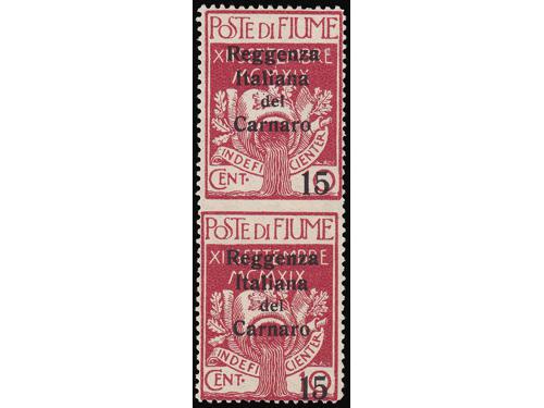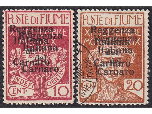 Aukcija br. 74 - Filatelija i razglednice Rijeka ** 174 - Marka 2 lire iz niza Riječki motivi u smeđemaslinastoj umjesto ljubičastoj boji. 300 EUR ☉ 175 - Porto pretisak 0.20 / 45 ii TIP. 50 EUR * 176 - FIUME porto crna brojka 12, strojni pretisak, 100 EUR ☉ 177 - FIUME porto 6 i 12 crne brojke, ručni pretisak IV tip. 150 EUR * 178 - Provizorno izdanje za Kvarner. PS br. 136 okomiti par, sredina nezupčana. 60 EUR * 179 - Provizorno izdanje za Kvarner. PS br. 136 vodoravni par sredina nezupčana. 60 EUR * 180 - Talijanska uprava za Kvarner PS br. 146 lijevo nezupčana. 40 EUR ☉ 181 - Provizorne marke za žurnu poštu s pretiskom „Reggenza Italiana del Carnaro ESPRESSO“. 100 EUR */⦿ 182 - Provizorno izdanje za Kvarner PS br. 138 i 142 dvostruki pretisak. 50 EUR * 183 - Marka iz niza Legionari, pretisak 10 lira na 20 centi. 90 EUR ✉ 184 - Preporučeno pismo upućeno iz Rijeke u Švicarsku 21.03. 1923. 40 EUR ✉ 185 - Dopisnica 2 kr. Michel br. P1 upućena iz Rijeke u Wahnsdorf 10.03. 1870. 14 EUR ←1234→