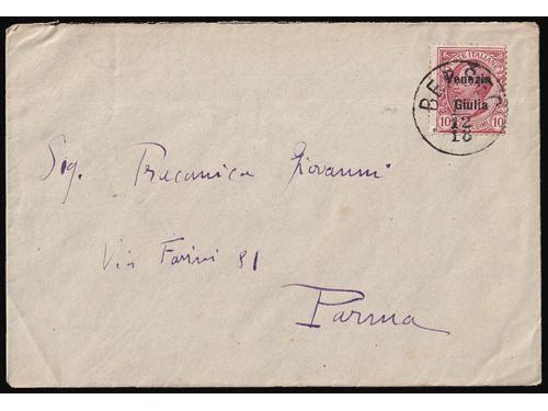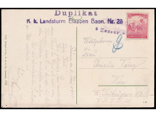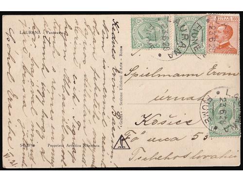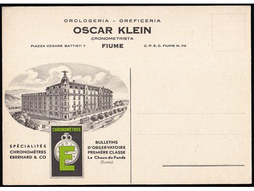 Aukcija br. 74 - Filatelija i razglednice Rijeka ✉ 186 - Razglednica Rijeke pisana u Rijeci i frankirana mađarskom markom te upućena u Beč 01.06. 1918. 14 EUR ✉ 187 - Razglednica Rijeke upućena iz Rijeke u Innsbruck 01.07. 1901 sa zanimljivim željezničkim žigom. 20 EUR ✉ 188 - Razglednica Lovrana upućena iz Lovrana u Mađarsku 23.06. 1928. 10 EUR ✉ 189 - Pismo upućeno iz Brseča u Parmu 15.12. 1918. 30 EUR ✉ 190 - Razglednica upućena iz Nonge u Rijeku 02.06. 1911. 16 EUR ✉ 191 - Zatvorena dopisnica upućena iz Rio de Janer-a u Rijeku 21.05. 1897. 25 EUR ✉ 192 - Poslovna dopisnica urara Oscara Kleina iz Rijeke. 25 EUR ✉ 193 - Promiđbena karta povodom 14 kongresa filatelista u Rijeci 1927, 20 EUR ✉ 194 - Razglednica s alegorijskim prikazom Rijeke u obliku djevojke te riječkog grba i boja talijanske zastave. 16 EUR ✉ 195 - Lot dvije tiskanice upućene iz Matulja u Italiju 28.10. 1936. i 16.08. 1941. 16 EUR ✉ 196 - Pismo upućeno iz Lovrana u Tel Aviv, Palestina 02.02. 1940. 14 EUR ✉ 197 - Razglednica Učke upućena iz poštanske agencije MONTE MAGGIORE / POKLON 40 EUR ←1234→
