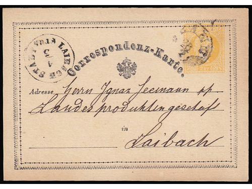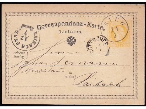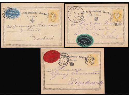 655 - Tri dvojezične dopisnice s naljepnicama tvrtki upućene iz Kočevja i Železnog u Ljubljanu 1874, 1875 i 1876 godine.
