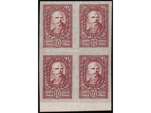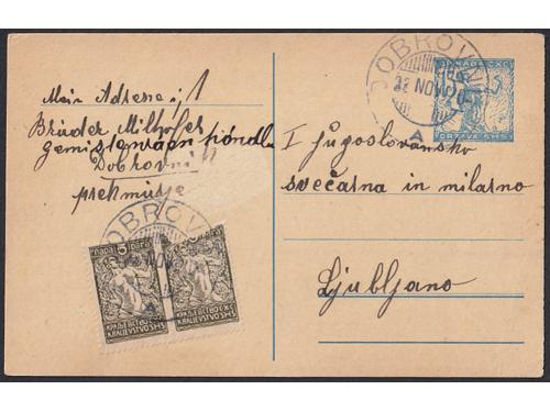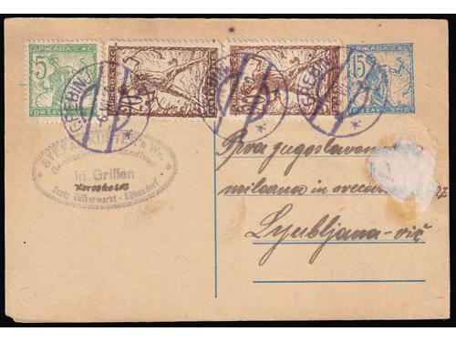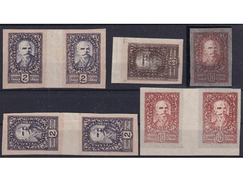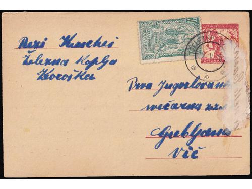 Aukcija br. 74 - Filatelija i razglednice Slovenija (*) 688 - Probni dvostruki otisak četverca marke od 2 dinara na novinama. 30 EUR (*) 689 - Probni otisak četverca 6 dinara na novinama. 30 EUR (*) 690 - 10 dinara, nezupčani četverac bez gume. 25 EUR (*) 691 - Marka 2 din. nezupčani vodoravni i okomiti par s međupoljem, 75 EUR ** 692 - Novinske marke, kompletan niz na rijetkom „K“ papiru prema HFS priručniku 130 EUR ✉ 693 - Razglednica Vrbasa upućena u Austriju 05.02. 1921., frankirana novinskom markom od 2 vinara. 95 EUR ** 694 - Lot maraka sve proboj tiska i pretiska, 30 EUR ✉ 695 - Dopisnica dofrankirana i upućena iz Brusnice u Ljubljanu 21.07. 1920. 16 EUR ✉ 696 - Paketna karta za paket upućen iz Celja u Sedlarjevo kod Podčetrtka 12.07. 1919. 20 EUR ✉ 697 - Dopisnica dofrankirana i upućena iz Grebinja (Koruška) u Ljubljanu 06.07. 1920. 50 EUR ✉ 698 - Dopisnica dofrankirana i upućena iz Dobrovnika (Prekmurje) 22.11. 1920 u Ljubljanu. 25 EUR ✉ 699 - Dopisnica dofrankirana i upućena iz ŽELEZNE KAPELE u Ljubljanu 20.05. 1920. 55 EUR ←123456789→