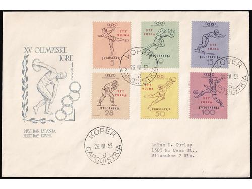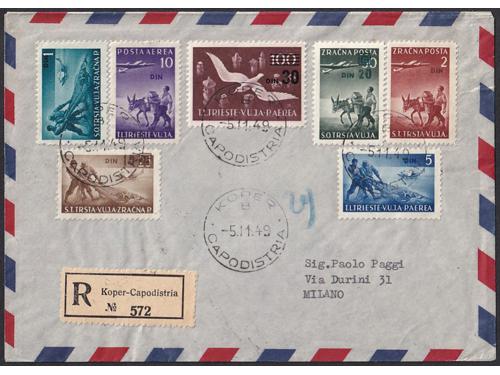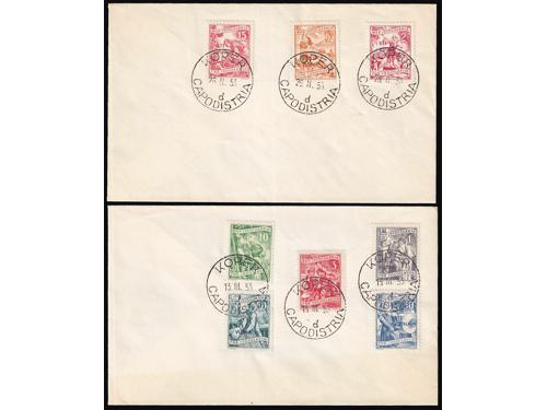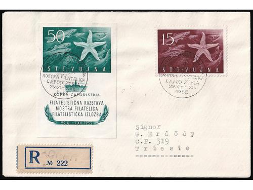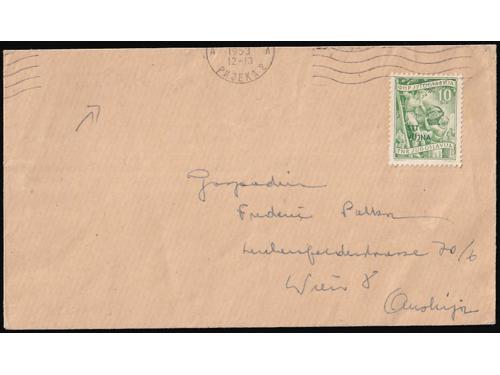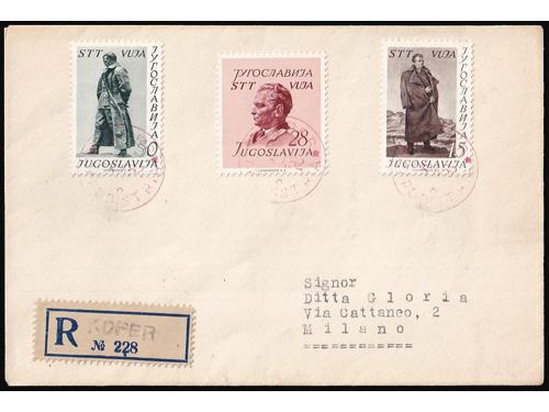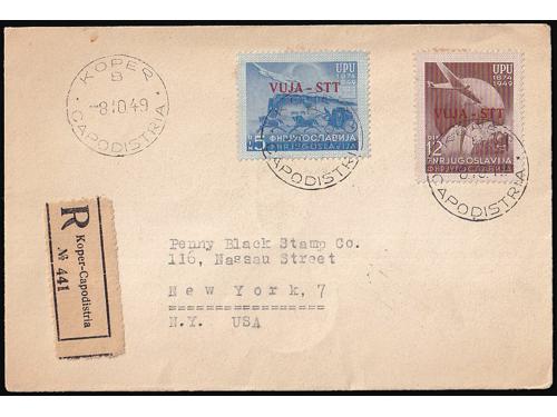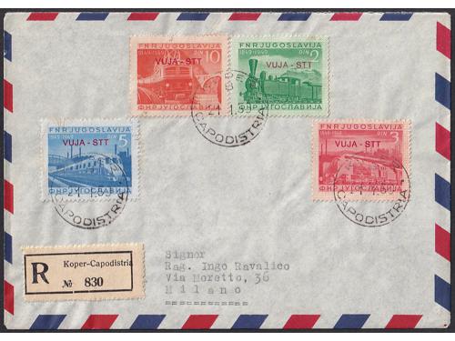 Aukcija br. 74 - Filatelija i razglednice STT Vuja ✉ 1202 - Preporučeno upućen FDC povodom godišnjice UPU iz Kopra u New York 08.10. 1949. 25 EUR ✉ 1203 - Preporučeno upućen FDC s markama za zračnu poštu iz Kopra u Milano 05.11. 1949. 50 EUR ✉ 1204 - Preporučeno upućen FDC povodom 100 godina željeznice u Jugoslaviji iz Kopra u Milano 21.01. 1950. 40 EUR ✉ 1205 - Preporučeno pismo upućeno 02.02. 1950 iz Kopra u Milano. 340 EUR ✉ 1206 - Preporučeno upućen FDC povodom Dana rada iz Kopra u Trst 01.05. 1951. 20 EUR ✉ 1207 - FDC povodom godišnjice UPU. Žig Kopar 04.02. 1952. 25 EUR ✉ 1208 - Peporučeno upućen FDC povodom 60 godina rođenja Tita, iz Kopra 25.05. 1952. u Trst. 30 EUR ✉ 1209 - FDC povodom olimpijade u Helsinkiju adresiran u USA. Žig Kopar 26.07. 1952. 40 EUR ✉ 1210 - Preporučeno upućen FDC povodom filatelističke izložbe 29.11. 1952 iz Kopra u Trst. 35 EUR ✉ 1211 - FDC privreda, dvije koverte sa žigom Kopar 26.02. i 13.03. 1953. 110 EUR ✉ 1212 - Tiskanica upućena s broda Krk preko pošte Rijeka u Beč 1953. godine. 20 EUR ✉ 1213 - FDC privreda II sa žigom Kopar 05.03. 1954. 50 EUR ←123456→