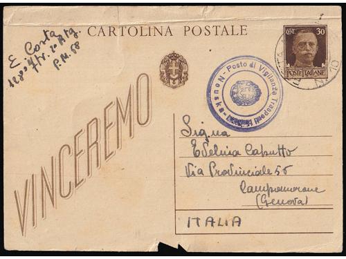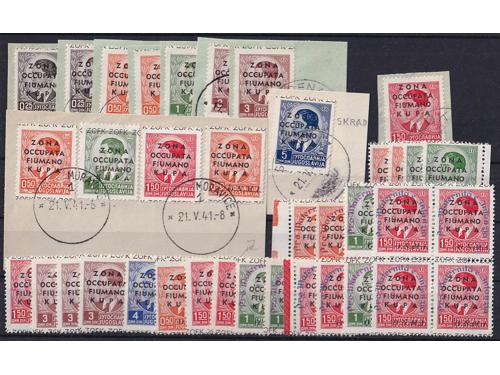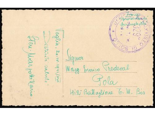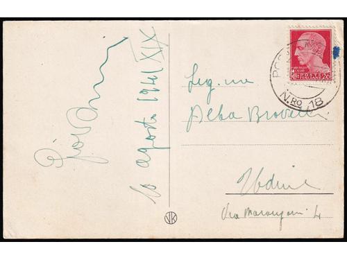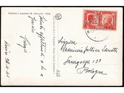 Aukcija br. 74 - Filatelija i razglednice Talijanska okupacija Hrvatske 1941-1943 ** 496 - Vodoravni par pretisak Memento Advere Sempere / MAS Buccari BP br. 18. 20 EUR ** 497 - BP br. 15-17, 18 i 19-21, odlična kvaliteta. 20 EUR ▲ 498 - Lot isječaka i maraka Talijanske okupacije Rijeke i Kupe ZOFK 50 EUR ✉ 499 - Razglednica Krka upućena s Krka u Pulu 20.04. 1941. 16 EUR ✉ 500 - Razglednica Ozlja mješovito frankirana talijanskom i markom NDH te preko vojne pošte PM 47 upućena u Firencu 16.04. 1943. 55 EUR ✉ 501 - Talijanska dopisnica upućena 15.02. 1943 preko vojne pošte PM 10. 20 EUR ✉ 502 - Razglednica Karlovca upućena preko talijanske vojne pošte PM 18 u Udine 10.08. 1941. 18 EUR ✉ 503 - Razglednica Dubrovnika upućena preko talijanske vojne pošte PM ? 17.05. 1941 u Italiju. 18 EUR ✉ 504 - Razglednica Crikvenice frankirana talijanskom markom i upućena preko vojne pošte PM 41 u Firenzu 22.05. 1941. 16 EUR ✉ 505 - Razglednica Knina upućena iz Knina u Bolognu (Italija) 23.09. 1941. 20 EUR ✉ 506 - Preporučeno pismo upućeno iz Senja u Zagreb 10.05. 1941. 30 EUR ✉ 507 - Talijanska dopisnica upućena sa Sušaka na Cetinje 19.08. 1941. 40 EUR 123→