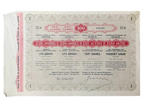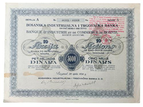 Aukcija br. 75 - Numizmatika, militarija Dionice - Bosna i Hercegovina 3139 - SARAJEVO, dionica "ZEMALJSKA BANKA ZA BOSNU I HERCEGOVINU", 100 dinara, 1. listopada 1922. 20 EUR 3140 - BEOGRAD, dionica "BOSANSKA INDUSTRIJALNA I TRGOVAČKA BANKA D.D.", 5 000 dinara, 20. travnja 1934. 16 EUR