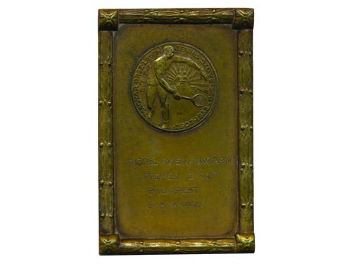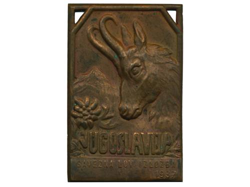 Aukcija br. 75 - Numizmatika, militarija Medalje - Jugoslavija 3184 - JUGOSLAVIJA, medalja Savezne lovačke izložbe 1937, za 3. mjesto (bronca), AE 41x64 mm, signirano GRIESBACH & KNAUS 20 EUR 3185 - BEOGRAD, ZEFIB I. zemaljska filatelistička izložba 1937, AE i emajl, 53x63 mm, -UNC 80 EUR 3186 - JUGOSLAVIJA, medalja TENIS YU - Mađarska 1940 AE, 64x100 mm 12 EUR 3187 - Jugoslavija, trofej teniskih radnika jugoslavije, emajl, AE - 54 mm, rijetko i atraktivno 30 EUR