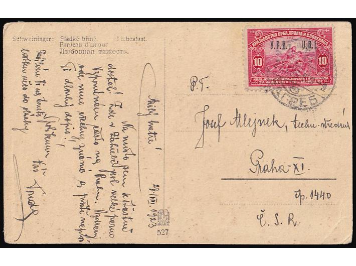 Opis: Čestitka upućena iz Zagreba u Prag 27.08. 1923. Frankirana redovnom markom s pretiskom URI koja nije imala frankaturnu vrijednost, prihvaćena je i otpremljena. Čestitka na prednjoj strani ima oštećenja slike.