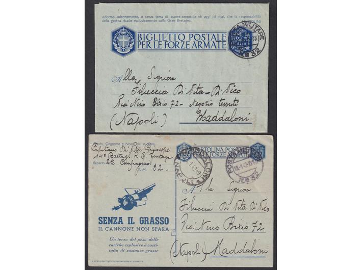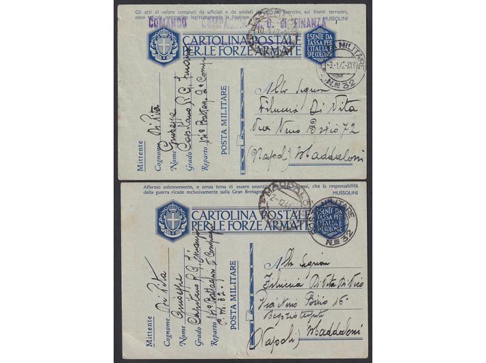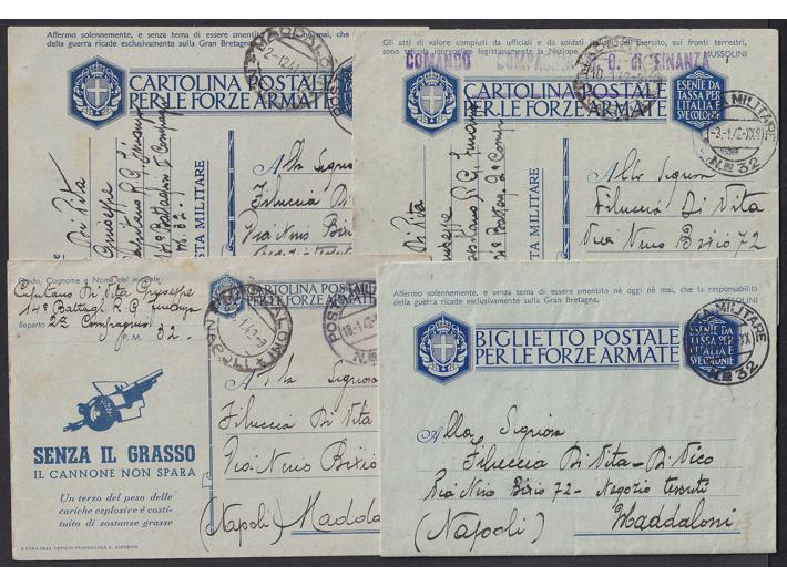 Opis: Četiri vojnopoštanske dopisnice upućene od pripadnika vojne pošte PM 32, pješačka divizija Marche sa sjedištem u Dubrovniku. Dobra kvaliteta.