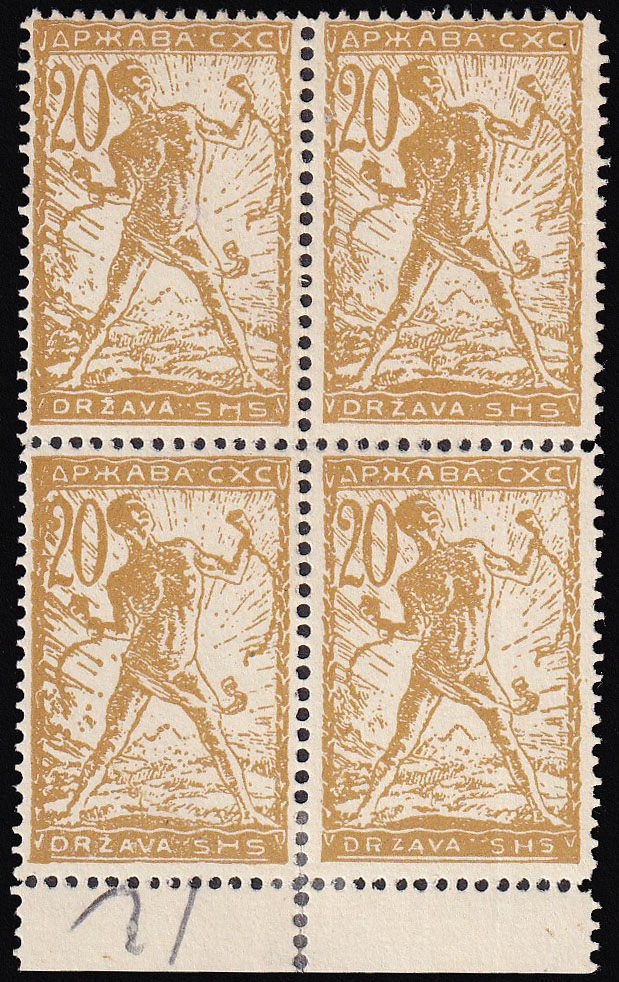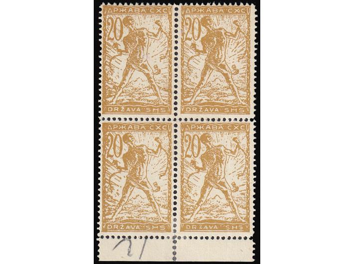 Opis: Četverac 20 vinara knjigotisak s donjom marginom u svijetloj maslinastosmeđežutoj boji (Zlatuša). Izuzetno rijetko u četvercu. Opisano u HFS br. 5 pod 13 Eb na str 323. Ex. Mirjan Vardjan, ex dr. Kobelbauer. Garancija aukcije.