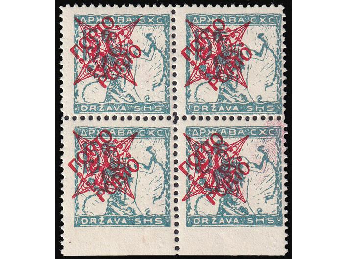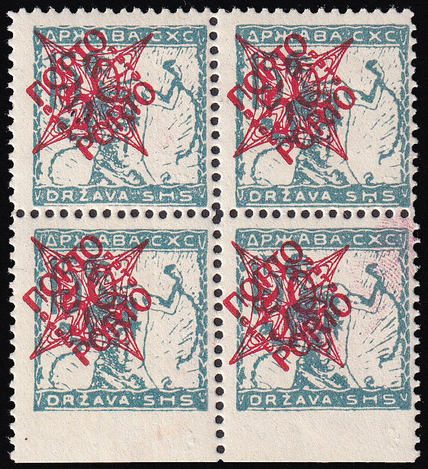 Opis: Četverac porto provizorija 50 para na 15 vinara u tirkizno plavoj boji. Dvije marke sa i dvije bez falca.
