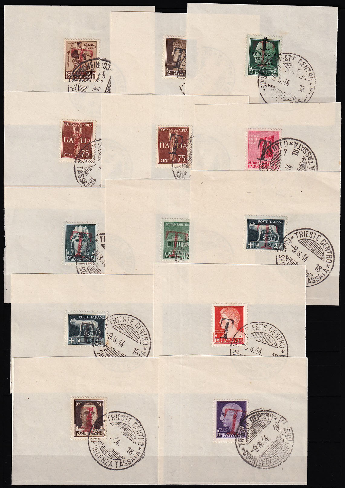 Opis: 13 izrezaka s naljepljenim markama poništenima žigom TRIEST CENTRO. Sve marke imaju ručni pretisak „T“ u crnoj ili crvenoj boji.