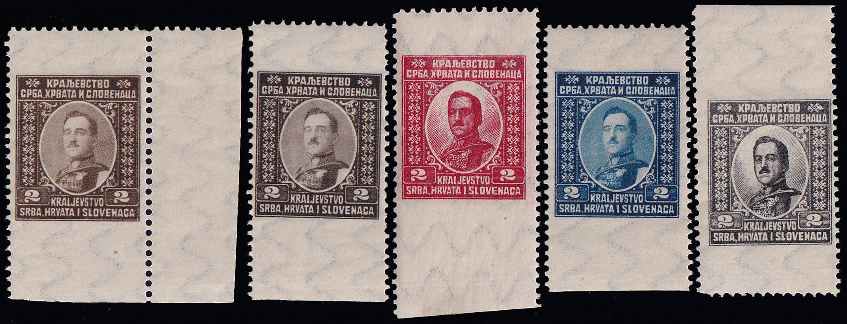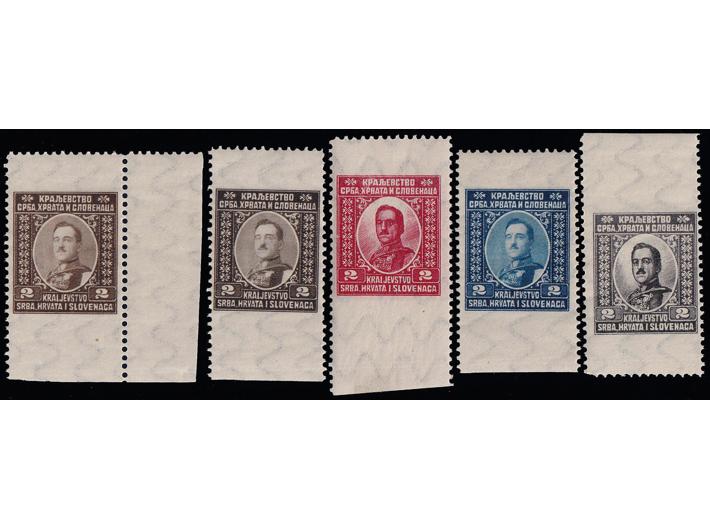 - 5 probnih otisaka u raznim bojama i nijansama neprihvaćenog idejnog rješenja za franko-niz Kraljevine SHS