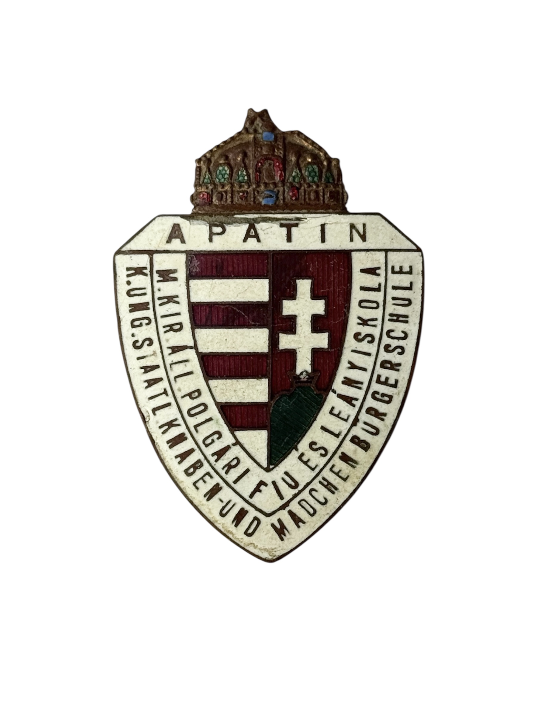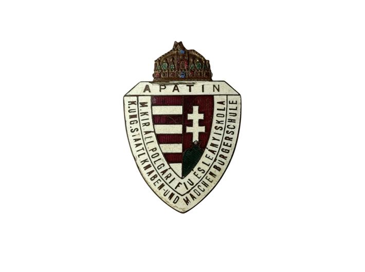 - APATIN, značka gradske škole za mladiće i djevojke iz Apatina, emajl, 36x51 mm