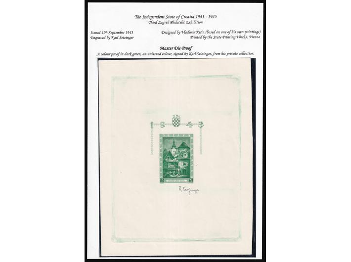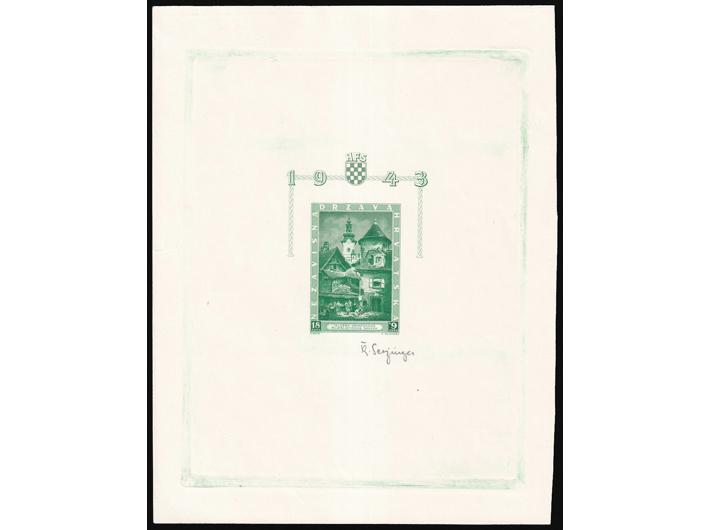 Opis: Autorska proba gravera Karla Seizingera za blok Dolac. Otisak na bijelom mekom i debljem papiru u tamnije zelenoj boji. Vrlo rijetko i atraktivno. Potječe iz osobne zbirke i ostavštine gravera. Na B&P aukciji LXIX vrlo sličan otisak postigao je 1700.- €. Odlična kvaliteta.