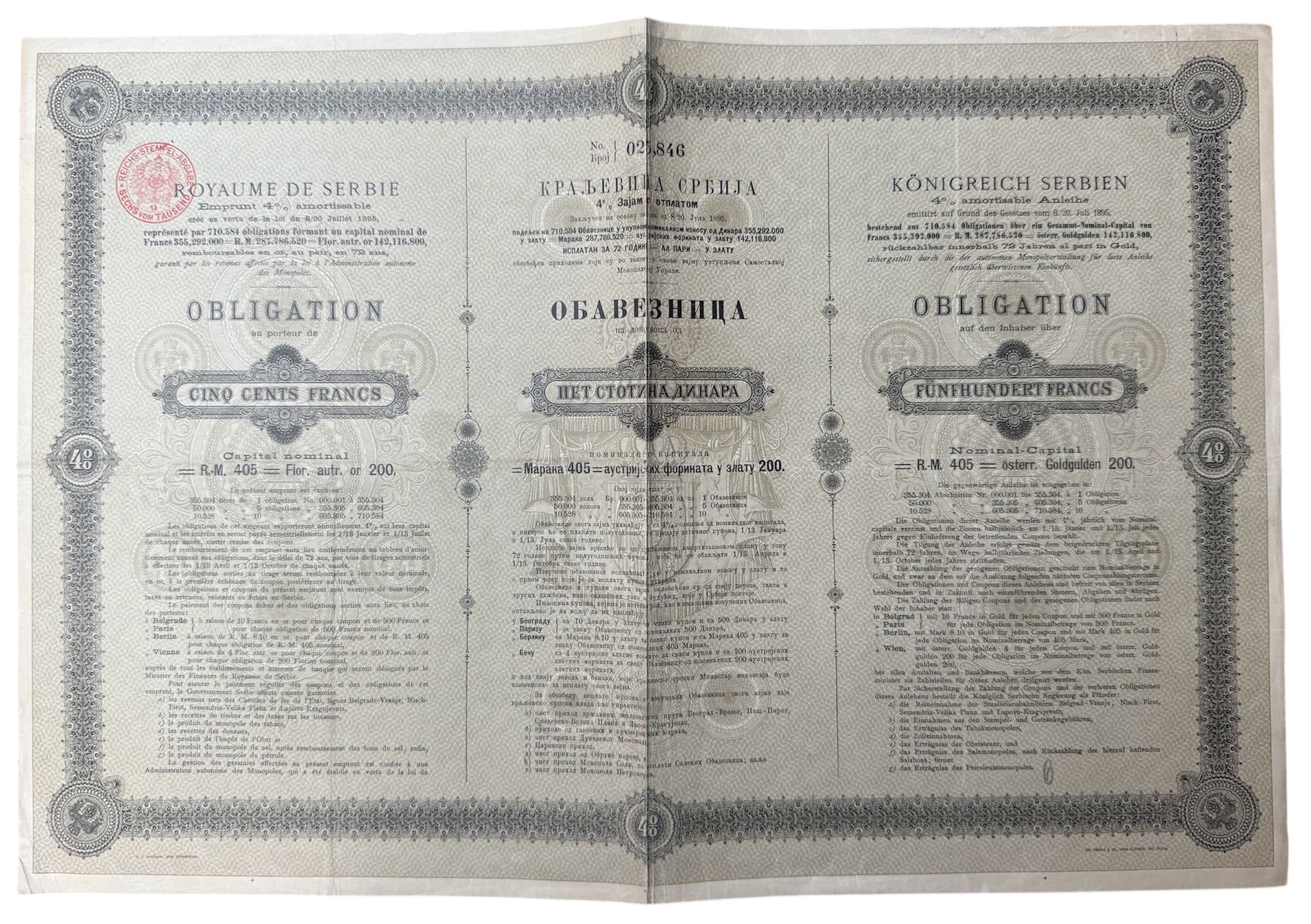 Opis: BEOGRAD, dionica "KRALJEVINA SRBIJA", 500 dinara, 8./20. lipnja 1895. 48,5x33 cm