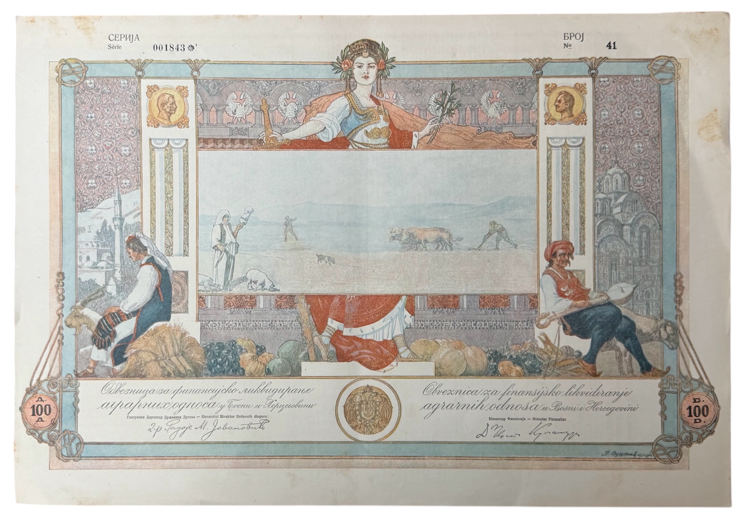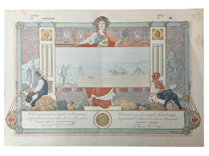 - BEOGRAD, KRALJEVINA SHS, dionica "FINANCIJSKO LIKVIDIRANJE AGRARNIH ODNOSA U BOSNI I HERCEGOVINI", 100 dinara, 18. lipnja 1921.