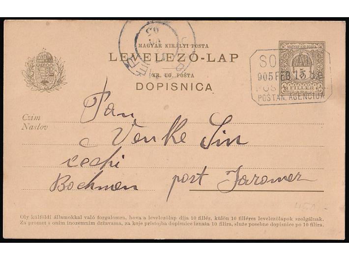 • Dopisnca upućena iz poštanske agencije SOLJANI u Češku 15.02. 1905.