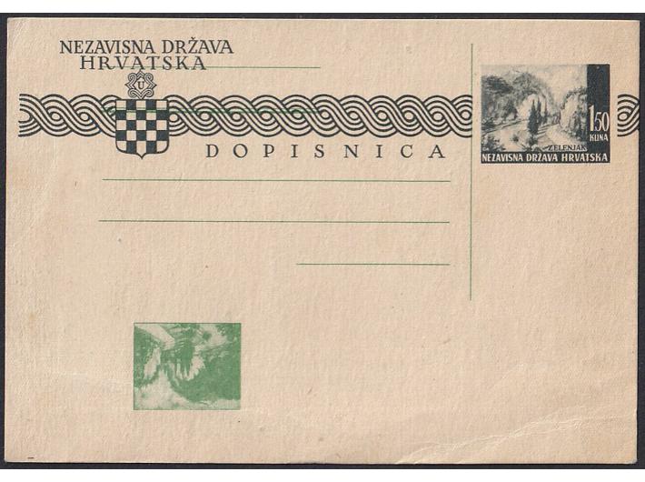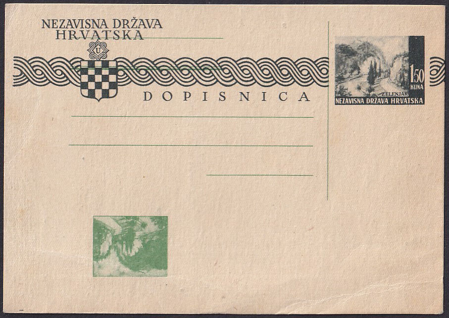 Opis: Dopisnica 1,5 kn Zelenjak s pogreškom tiska nastalim krivim umetanjem u tiskarski stroj pa je otisak svjetlozelene boje podtiska vrijednosti i crtovlja za pisanje adrese obrnut u odnosu na naziv države, grb i fazu otiska vrijednosti. Vrlo atraktivno, rijetko i do sada nezabilježeno u literaturi. Na poleđini žute mrlje u papiru.