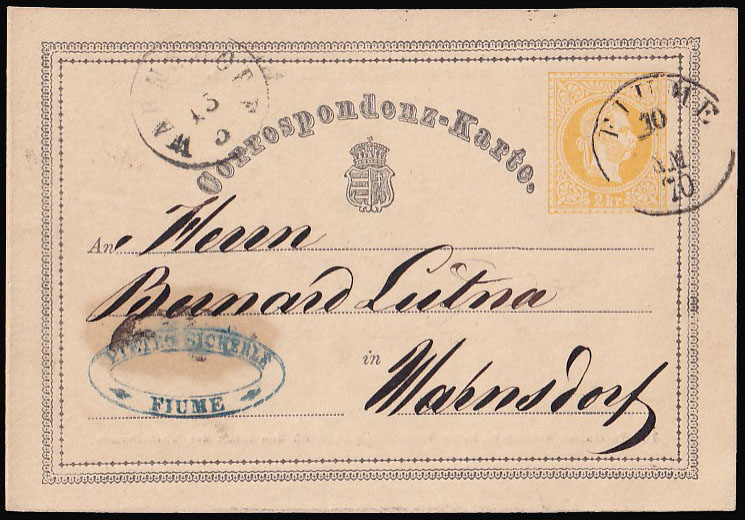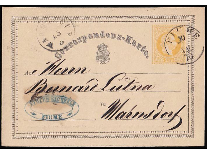- Dopisnica 2 kr. Michel br. P1 upućena iz Rijeke u Wahnsdorf 10.03. 1870.