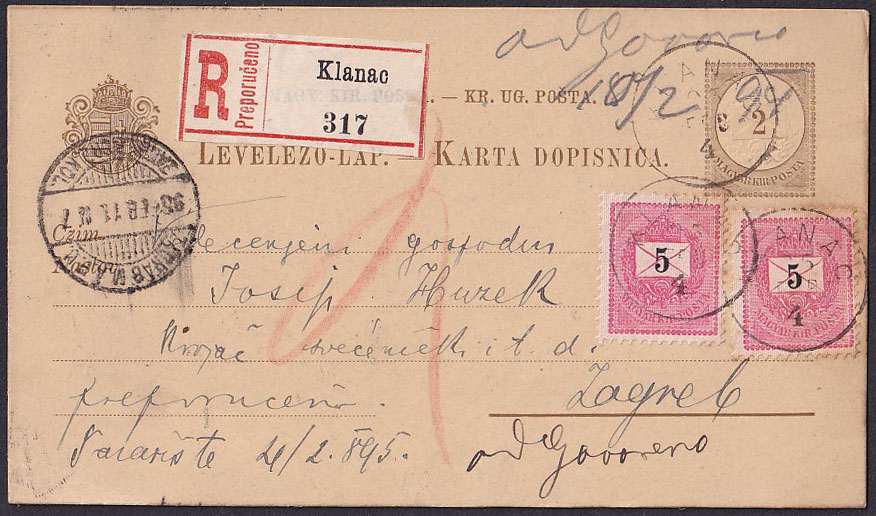 - Dopisnica dofrankirana i preporučeno upućena iz Klanca u Zagreb 05.02. 1896.