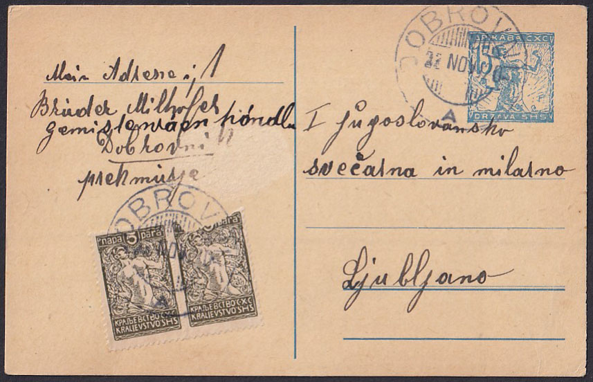 • Dopisnica dofrankirana i upućena iz Dobrovnika (Prekmurje) 22.11. 1920 u Ljubljanu.