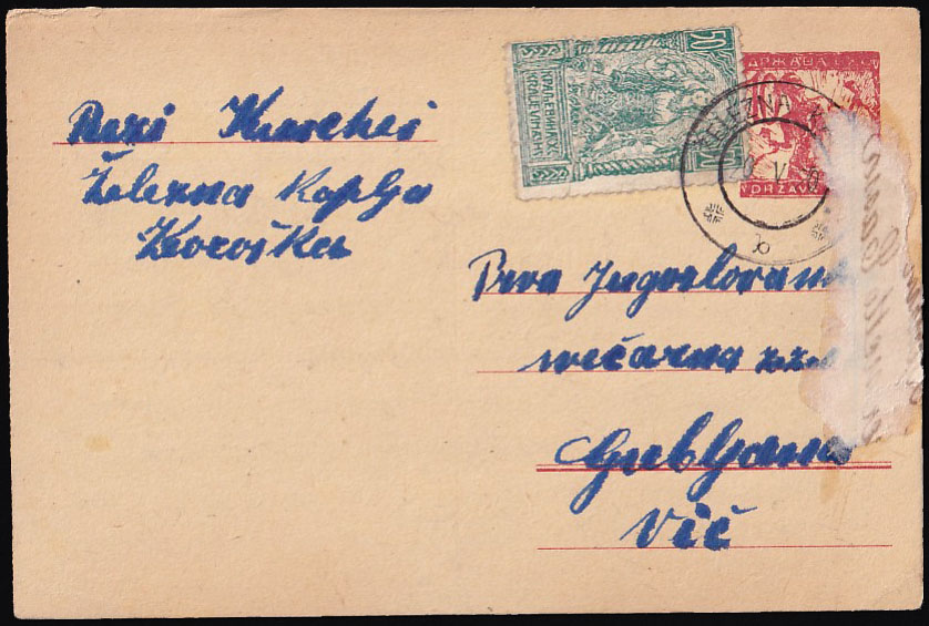 • Dopisnica dofrankirana i upućena iz ŽELEZNE KAPELE u Ljubljanu 20.05. 1920.