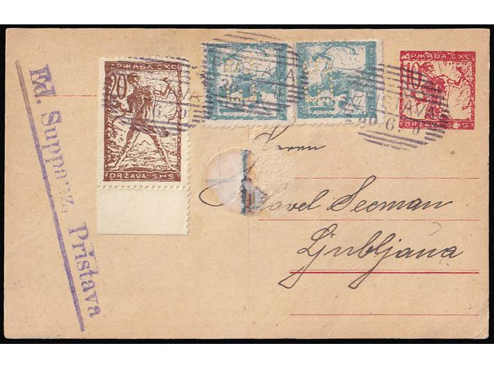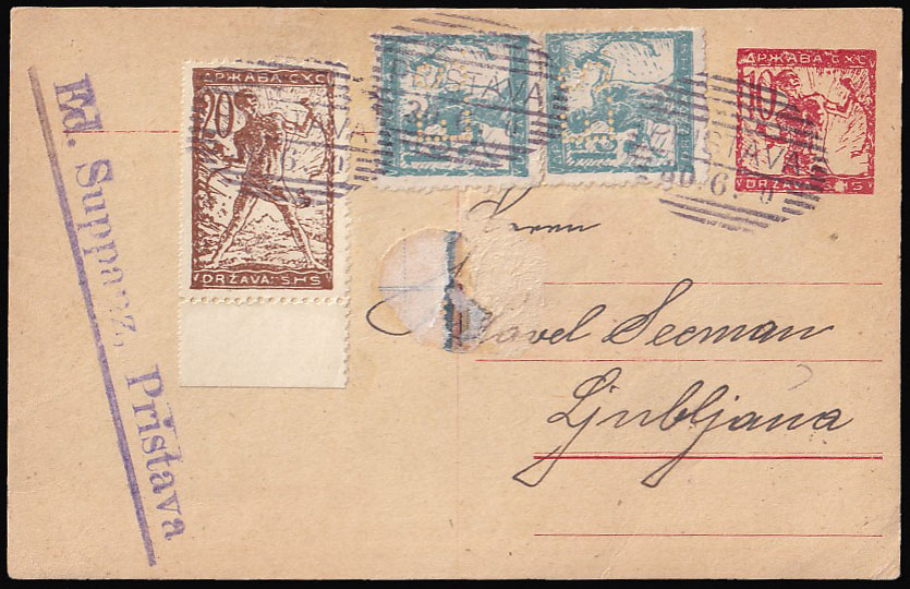 - Dopisnica dofrankirana perforiranim markama E.S. (Eduart Suppanz) i upućena iz Pristava (kod Tuhlja) u Ljubljanu.