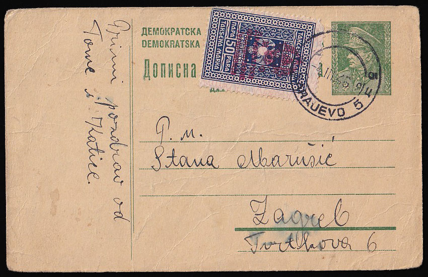 • Dopisnica, dofrankirana provizornim biljegom od 50 para i upućena iz Sarajeva u Zagreb 04.03. 1946.