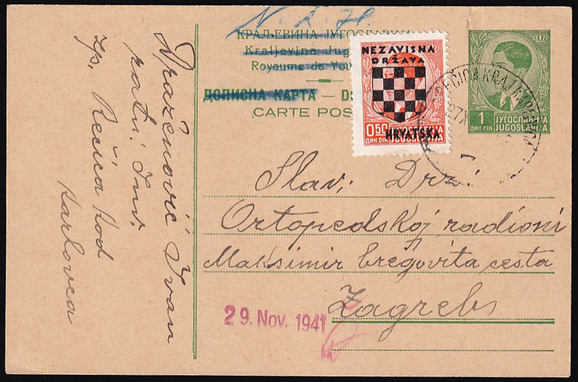 Opis: Dopisnica kraljevine Jugoslavije dofrankirana markom iz niza Grbače i upućena iz Rečice kraj Karlovca u Zagreb 27.11. 1941. Rukom u plavoj boji izvršena nacionallizacija dopisnice. Odlična kvaliteta, vrlo rijedak poštanski žig (Cividini 636b).