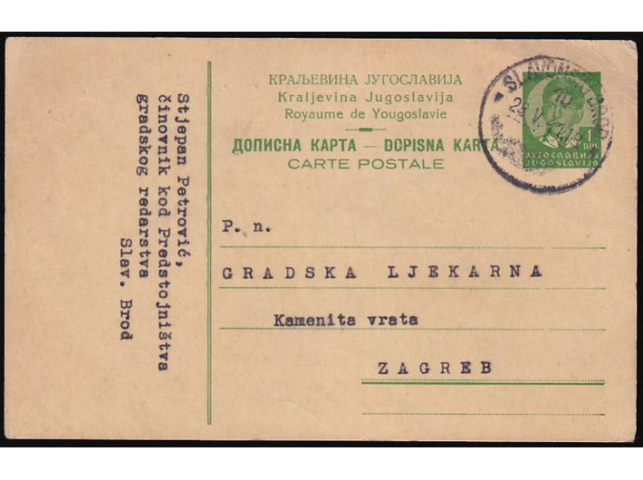 Opis: Dopisnica kraljevine Jugoslavije s likom malog Petra (koja je u trenutku proglašenja NDH bila izvan uporabe) upućena iz Slavonskog Broda u Zagreb 28.05. 1941. Naslovljena na gradsku ljekarnu čiji se prijemni žig nalazi na poleđini. Odlična kvaliteta, vrlo rijetko.