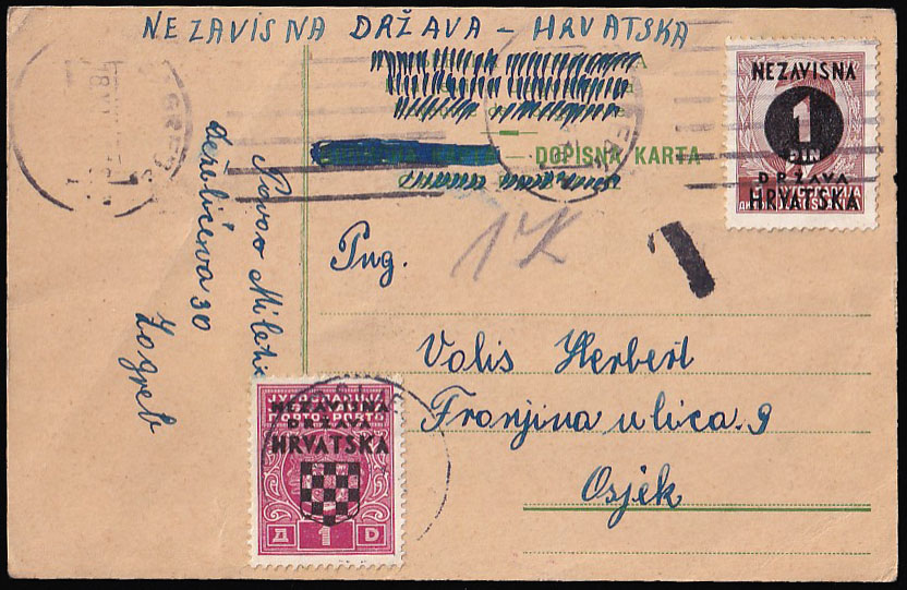 Opis: Dopisnica kraljevine Jugoslavije upućena 18.11. 1941 iz Zagreba u Osijek. Frankirana markom 1 din. preko vrijednosti dopisnice, tako da je frankatura nedostatna te je u dolazu točno portirana s provizornom porto markom od 1 din. Pošiljatelj je ručno izvršio nacionalizaciju dopisnice precrtavanjem naziva prijašnje države i upisivanjem naziva nove. Dobra kvaliteta, rijetko i atraktivno.