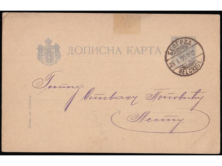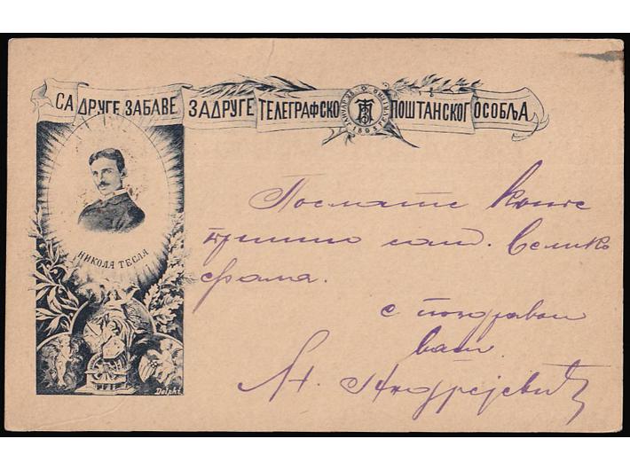 Opis: Dopisnica Michel br. I iz 1895 s likom Nikole Tesle i natpisom „Sa druge zabave zadruge telegrafsko poštanskog osoblja“. Upućena loko Beograd 28.1. 1895. Primatelj je Stevan V. Popović kulturni pregalnik u Austrougarskoj i dugogodišnji upravnik budimpeštanskog Tekelijanuma. Njena uporaba je bila moguća samo jedan dan i to upravo na ovaj datum. Poštanski upotrebljena je izuzetno rijetka, naklada samo 100 kom. Gornji rub, blago zaderan u dubinu 8 mm i repariran.