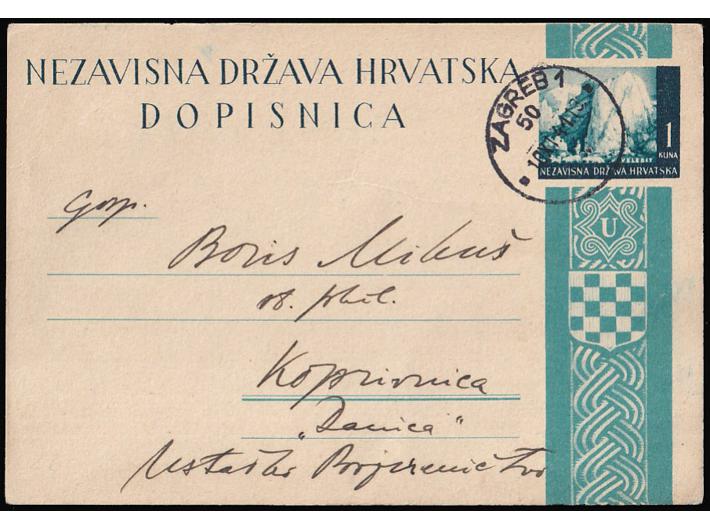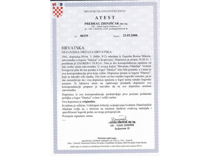 Opis: Dopisnica Michel br. P-2 upućena iz Zagreba Borisu Mikušu, zatočeniku logora Danica u Koprivnici 10.11. 1941. Dopisnica je dio jedine poznate korespondencije ulazne pošte u logor. Iz fotoatesta Zrinjšćak ”....Dopisnice pisane iz logora “Danica” koje su također vrlo rijetke, vrlo često su bez oznaka logorske cenzure, pa je tim razumljivije da i ova dopisnica upućena u logor nema oznake logorske cenzure. Iz tekstova meni na ispitivanje predanih dopisnica ove korespondencije potpuno je razvidno da su sve dopisnice uručene zatvoreniku. Dopisnice iz ove korespondencije predstavljaju prve poznate poštanske pošiljke u logor “Danica” a time i veliki raritet..” Odlična kvaliteta, izuzetna rijetkost.