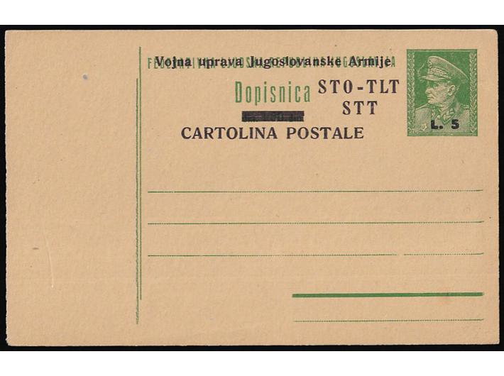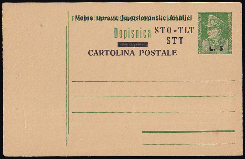 Opis: Dopisnica Michel br. P1 pretisak 5 lira na 1,5 din. slovenski tekst Jugoslovanske. Odlična kvaliteta, rijetko.
