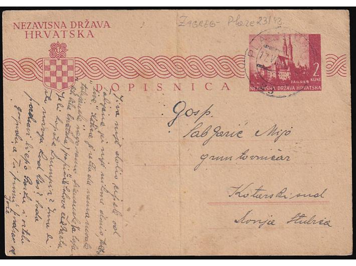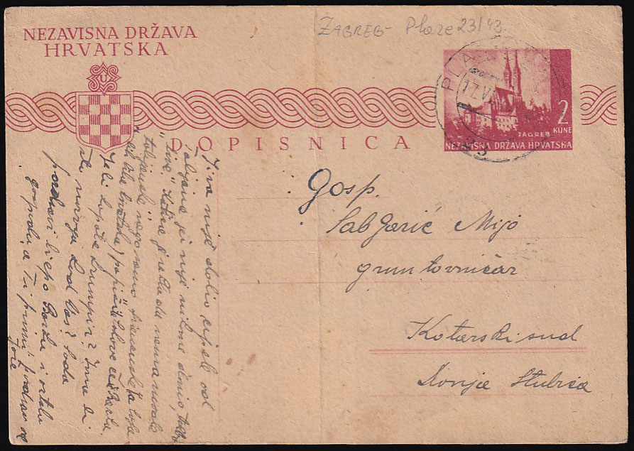 - Dopisnica pisana u Mostanjama i predana na prugu PLASE-ZAGREB 23 upućena u Donju Stubicu 17.06. 1943.