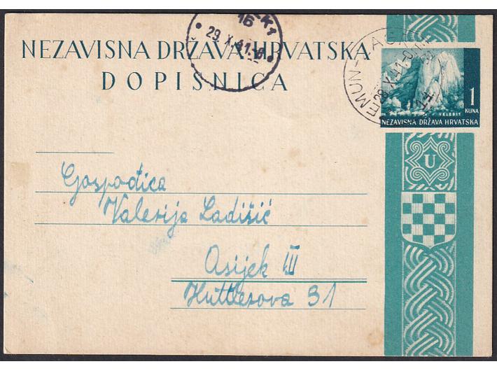 Dopisnica pisana u Rumi i upućena prugom ZEMUN-ZAGREB 14 u Osijek 28.10. 1941.