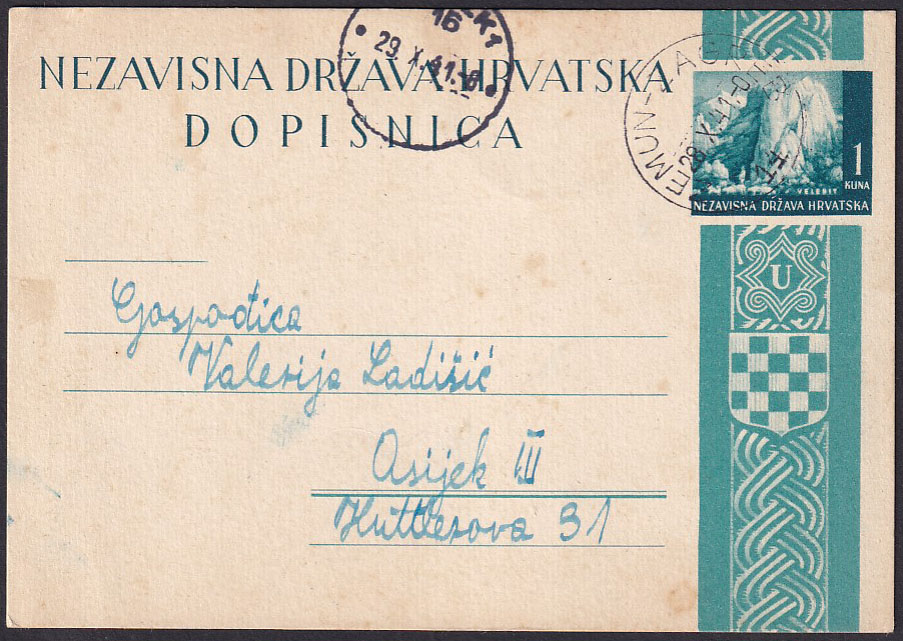 • Dopisnica pisana u Rumi i upućena prugom ZEMUN-ZAGREB 14 u Osijek 28.10. 1941.
