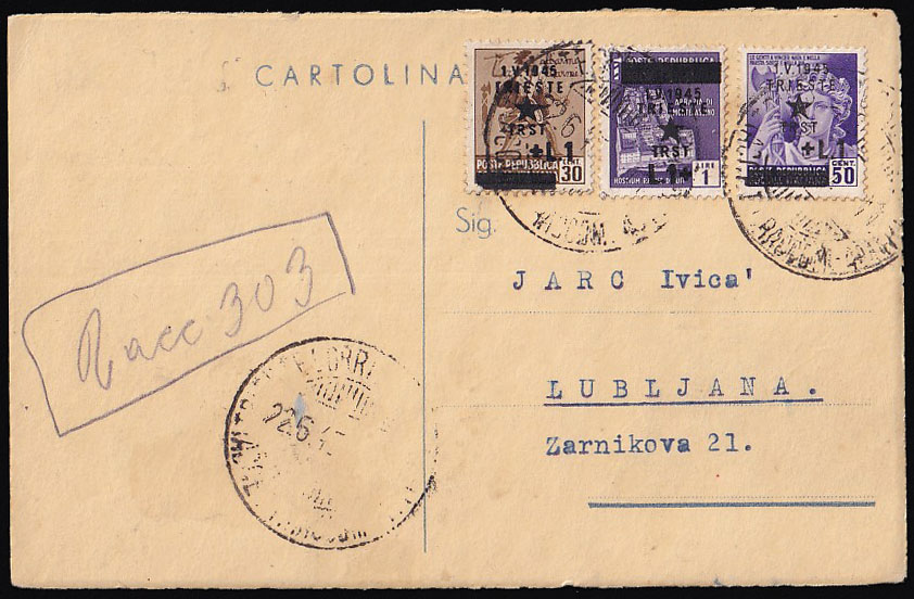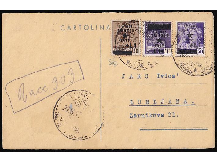 Dopisnica preporučena iz Trsta u Ljubljanu 22.06. 1945.