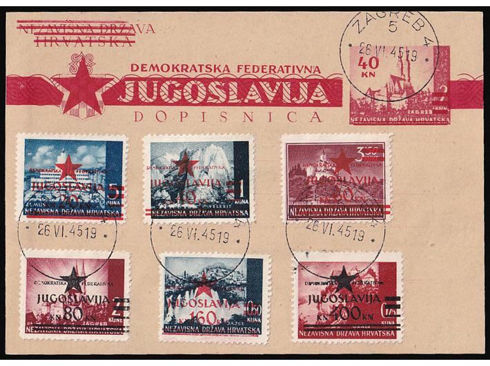 - Dopisnica, provizorno izdanje za Zagreb frankirana sa 6 raznih maraka provizornog izdanja za Zagreb