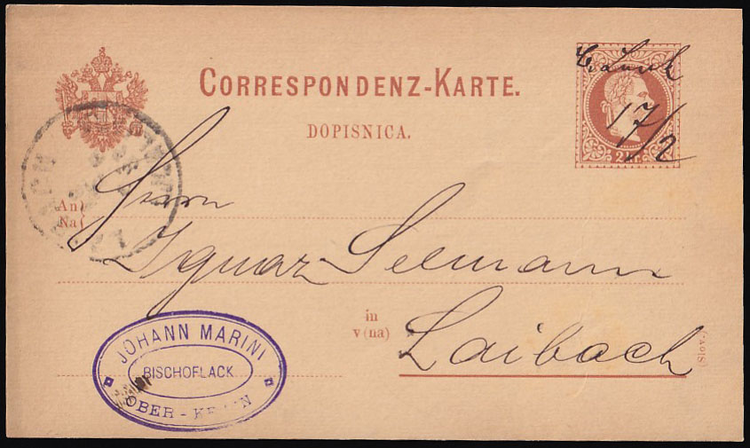• Dopisnica ručno poništena B. Lach 17/2 (Bischoflack 17.02. 1882) i upućena u Ljubljanu.