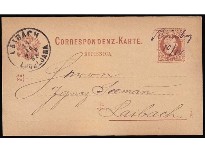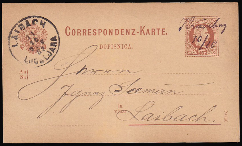 • Dopisnica ručno poništena Krainburg 10.10. (1882) i upućena u Ljubljanu.