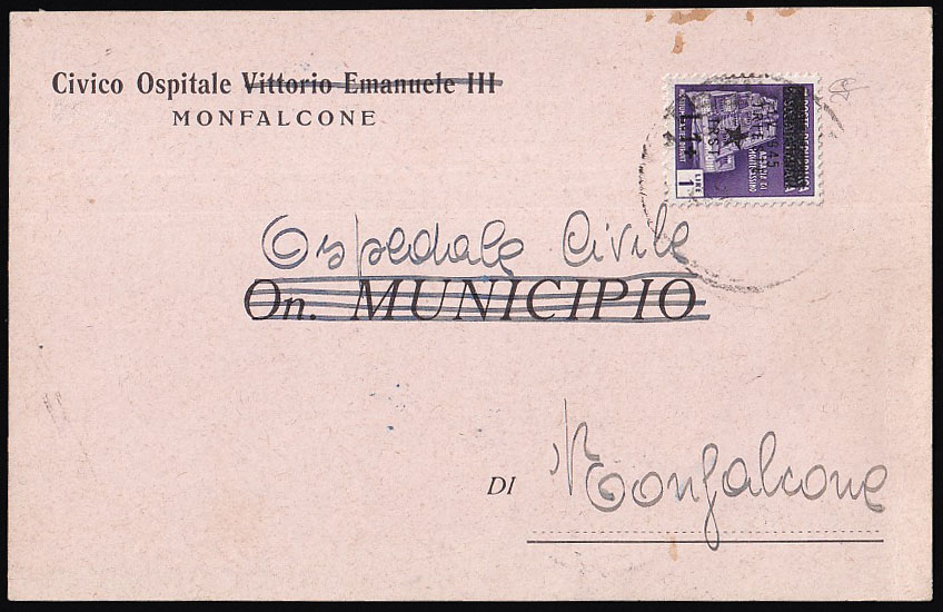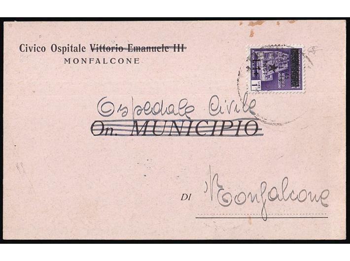 Opis: Dopisnica upućena iz bolnice u Trstu, žig RONCHI DEL LEGIONATI u Monfalcone 20.06. 1945. Točna frankatura.