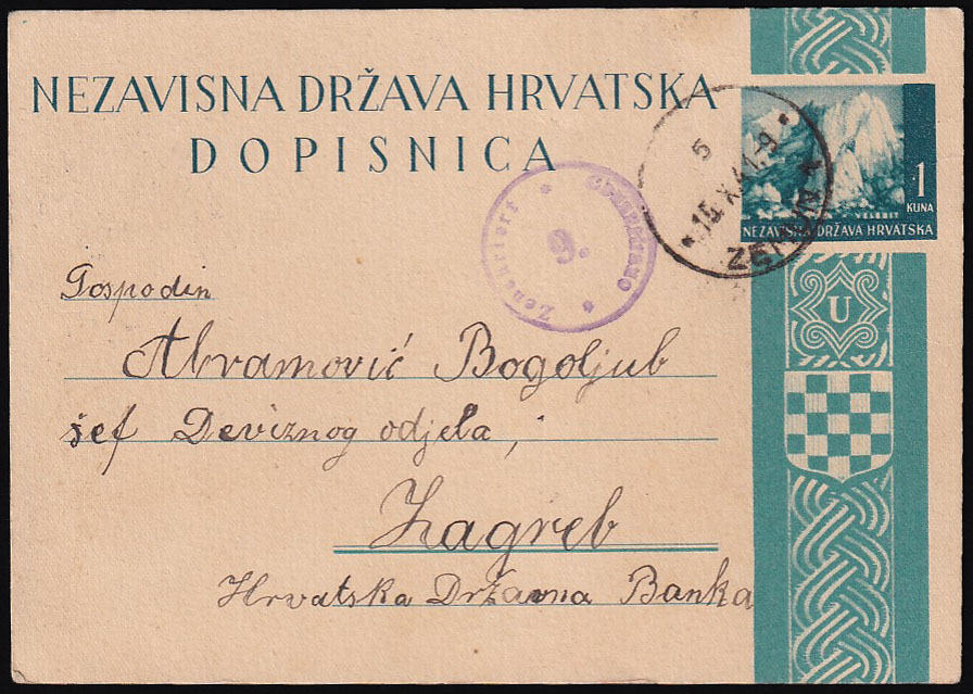 Opis: Dopisnica upućena iz Zemuna u Zagreb 15.10. 1941. U odlasku cenzurirana po cenzuri Zemun 9 opisanoj u Pervan-Zrinjšćak na str. 56/58. Odlična kvaliteta.