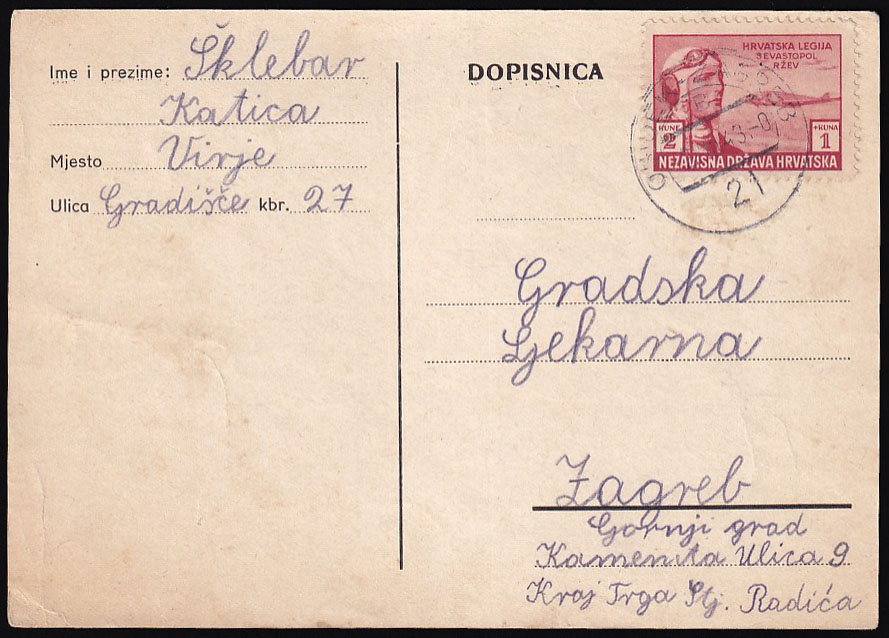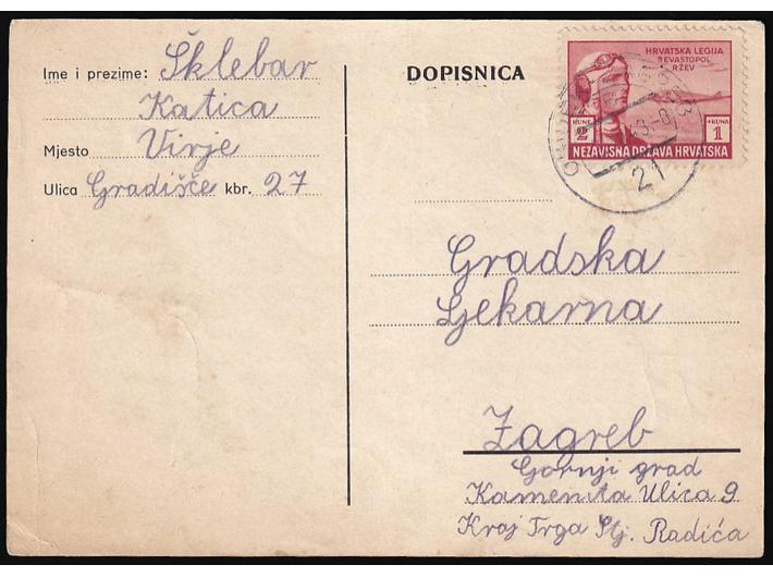 - Dopisnica upućena prugom OSIJEK-ZAGREB 21 u Zagreb 02.08. 1943.