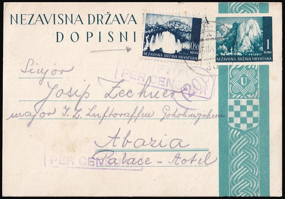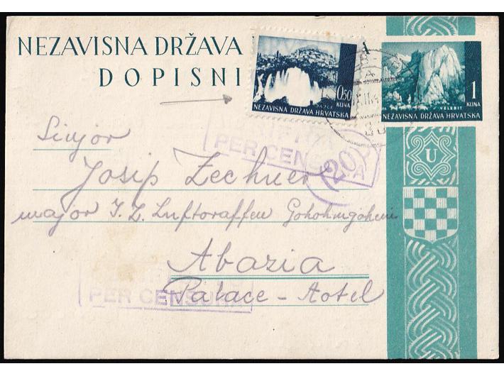 Opis: Dopisnica upućena prugom ZAGREB-SPLIT 30. u Opatiju. Pisana u Plaškom 22.12. 1941. Cenzurirana po talijanskoj vojnoj cenzuri. Dobra kvaliteta.